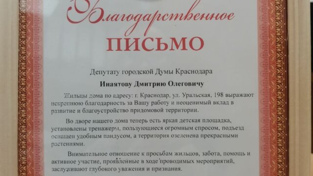 «Очень приятно было получить благодарность от председателя Совета ТОС № 214», — написал в своем телеграм-аккаунте Дмитрий Инаятов.