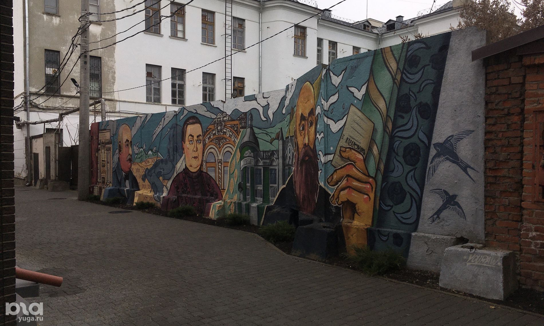 © Фото Александра Гончаренко, Юга.ру © Фото Александра Гончаренко, Юга.ру © Фото Александра Гончаренко, Юга.ру © Фото Александра Гончаренко, Юга.руРосписи отсылают к биографиям изображенных личностей: например, Дицман закупал зерно для своих мельниц и продавал муку в 1880-х, а с 1886 по 1920 год Губкина владела «Гранд-отелем» на углу нынешних Гимназической и Красной.