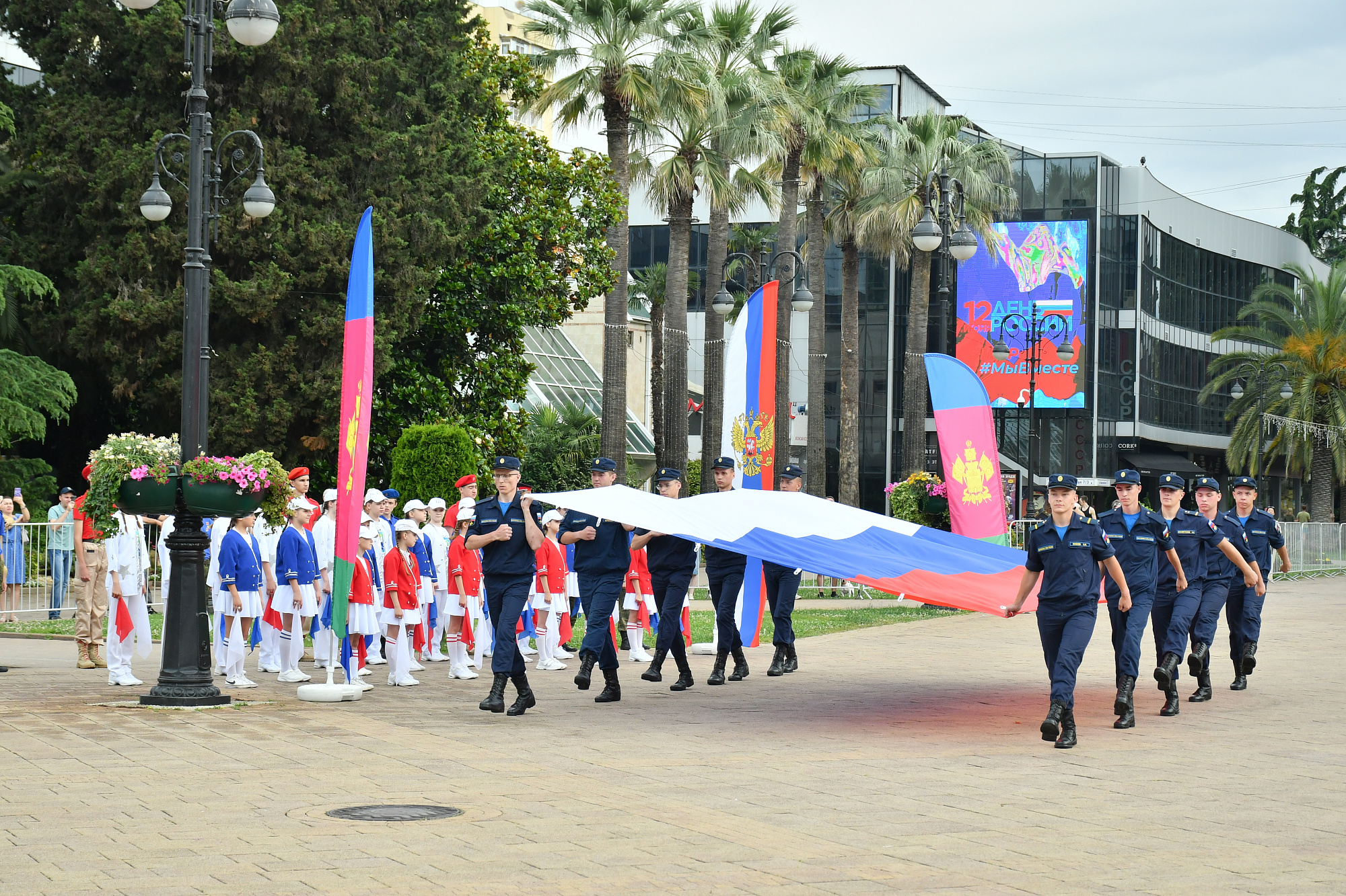 На медиаэкранах во всех районах города транслируется праздничный контент, посвященный Дню России. Флаги Российской Федерации вывешены на зданиях всех учреждений курорта. Вечернее световое оформление городской телевизионной вышки и гостиницы «Жемчужина» также выполнено в цветах национального триколора.