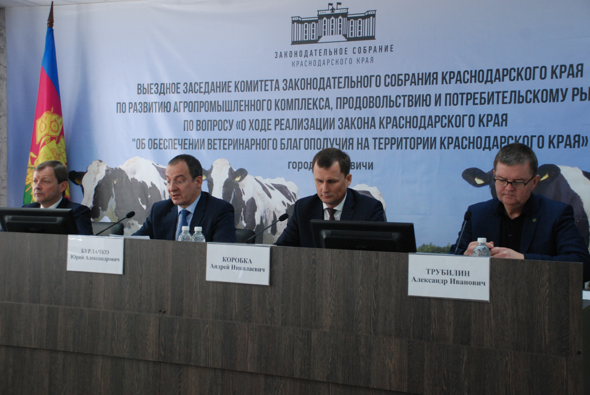 Под председательством руководителя ЗСК Юрия Бурлачко, в присутствии заместителя губернатора Кубани Андрея Коробка парламентарии комитета ЗСК по развитию агропромышленного комплекса, продовольствию и потребительскому рынку обсудили вопрос «О ходе реализации закона КК «Об обеспечении ветеринарного благополучия на территории Краснодарского края».