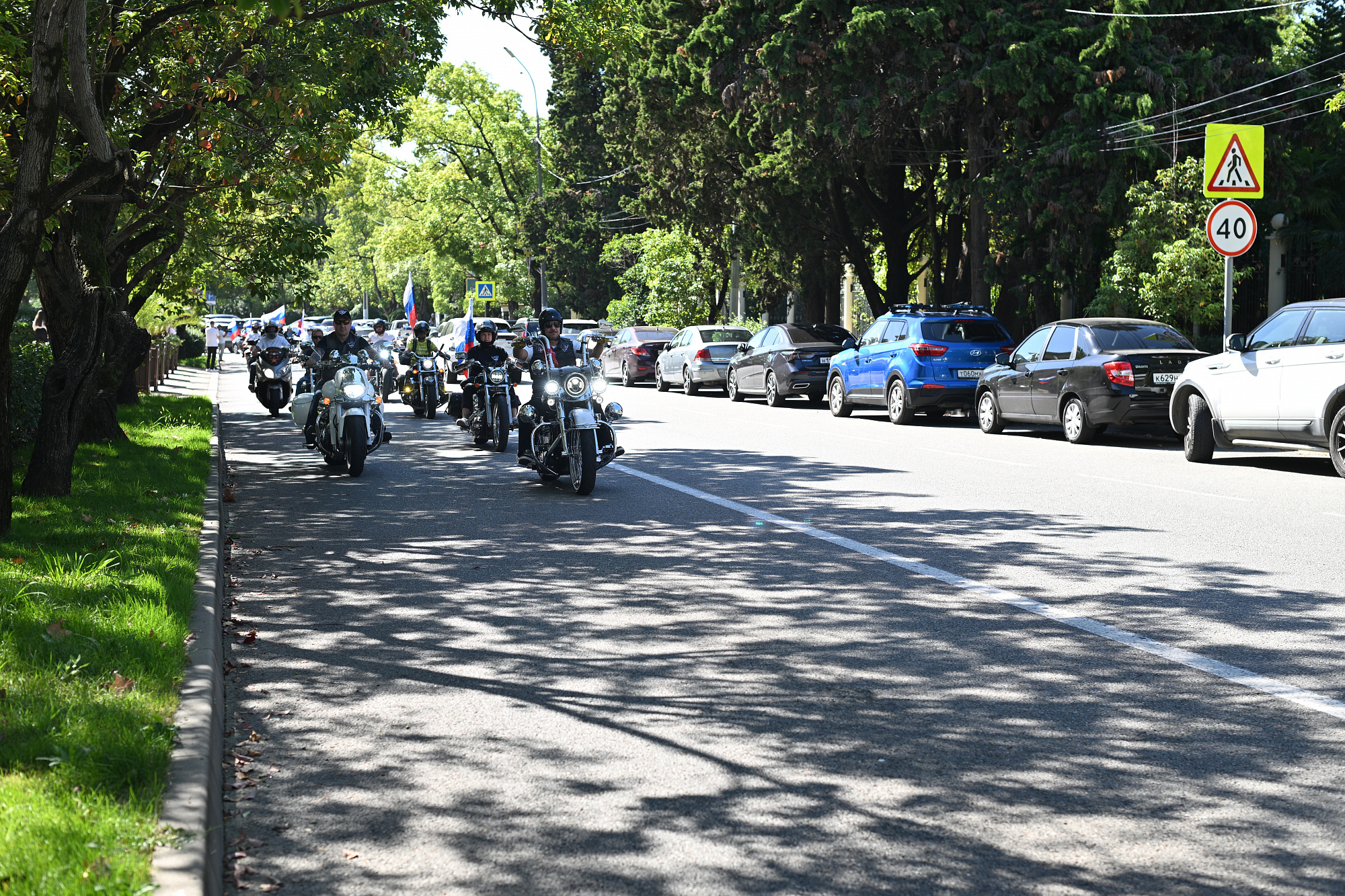 Праздничный мотопробег состоялся сегодня в центре Сочи. В нем приняли участие 30 транспортных средств, украшенных российским триколором. Колонна стартовала от Зимнего театра и продолжила маршрут по улицам Центрального и Хостинского районов.