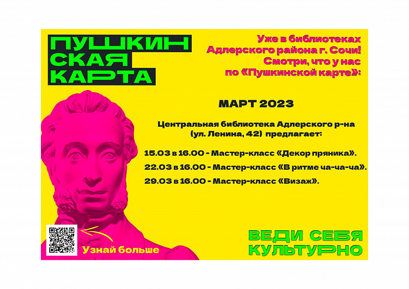 Список учреждений культуры, участвующих в проекте на курорте, регулярно пополняется. В марте к реализации программы «Пушкинская карта», разработанной в рамках нацпроекта «Культура» присоединилась Централизованная библиотечная система Адлерского района города. В библиотеках будут проходить различные мастер-классы, встречи и лекции. В Центральной библиотеке Адлерского района обладатели «Пушкинской карты» смогут посетить мастер-класс «Декор пряника», на котором их научат расписывать имбирные пряники с помощью разноцветного айсинга — специального крема из сахарной пудры. Мероприятие пройдет 15 марта в 16:00. 22 марта в это же время состоится танцевальный мастер-класс «В ритме ча-ча-ча». А 29 марта в 16:00 пройдет мастер-класс по визажу. — Программа «Пушкинская карта» действует на курорте с 2021 года и пользуется популярностью у сочинской молодежи. Благодаря ей можно посещать культурные мероприятия во всех муниципальных музеях, театрах и концертных учреждениях, домах культуры Центрального, Лазаревского и Адлерского районов. Это позволяет приобщить молодых людей к прекрасному, привить духовные ценности и любовь к искусству, — рассказала начальник управления культуры администрации Сочи Марианна Устинова. Пушкинскую карту могут оформить граждане России в возрасте от 14 до 22 лет. Лимит карты обновляется каждый год 1 января. В 2023 году он составляет 5 тысяч рублей. Эти средства можно потратить на посещение музеев, театров, выставок, концертов. Полная афиша мероприятий и учреждений доступна в мобильном приложении «Госуслуги. Культура» и на портале Культура.РФ.