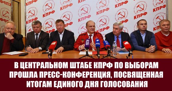 Вечером 10 сентября в Центральном штабе КПРФ по выборам прошла пресс-конференция руководства Компартии, посвященная итогам Единого дня голосования. В ней приняли участие Председатель ЦК КПРФ Г.А. Зюганов, первый заместитель Председателя ЦК КПРФ Ю.В. Афонин, заместители Председателя ЦК КПРФ В.И. Кашин, Д.Г. Новиков, Л.И. Калашников, член Президиума, секретарь ЦК КПРФ С.П. Обухов, секретарь ЦК КПРФ А.А. Ющенко.