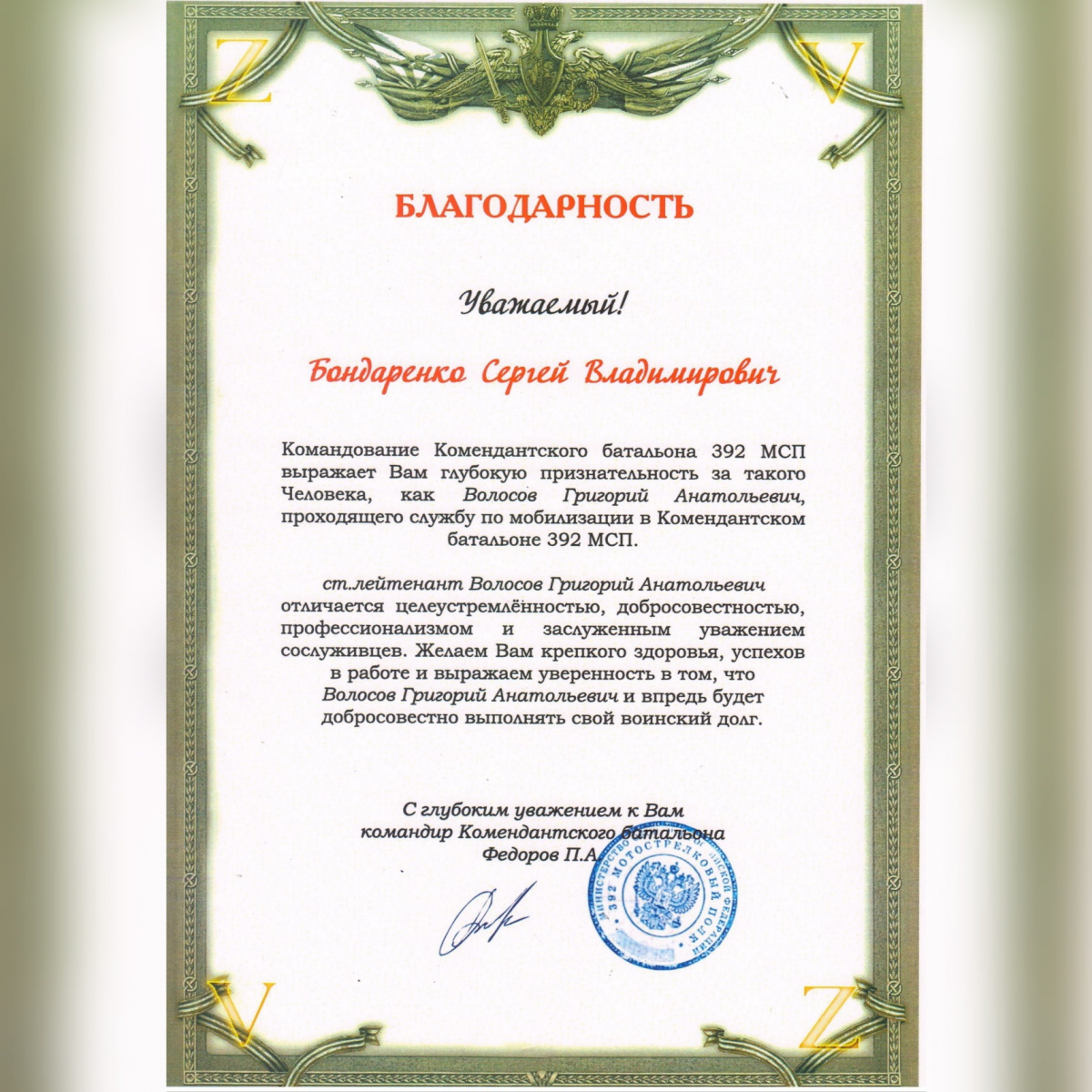 «… Командование Комендантского батальона 392 МСП выражает Вам глубокую признательность за такого Человека, как Волосов Григорий Анатольевич, проходящего службу по мобилизации…Старший лейтенант Волосов Григорий Анатольевич отличается целеустремленностью, добросовестностью, профессионализмом и заслуженным уважением сослуживцев…», - говорится в письме.