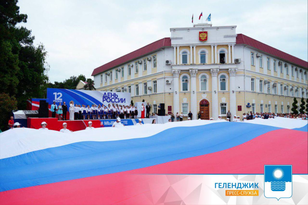 В Геленджике праздник открылся флешмобом: молодежь развернула на Центральной площади города триколор площадью 300 кв. метров. Размеры полотна призваны продемонстрировать, насколько огромна Россия.