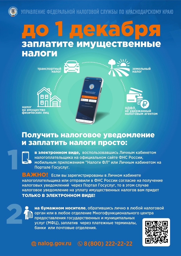 Федеральная налоговая служба напоминает! 1 декабря 2023 года — срок уплаты имущественных налогов за 2022 год.