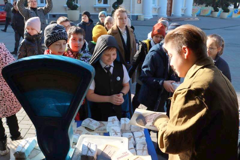 Утром стартовала традиционная акция «Блокадный хлеб». На Центральной площади волонтеры молодежного центра «Пульс» установили палатку и раздавали всем желающим завернутые в бумагу и перевязанные бечевкой блокадные 125 граммов блокадного хлеба. Вместе с пайкой, молодежь рассказывала юным и взрослым горожанам о том, какими для ленинградцев были эти 872 блокадных дня.
