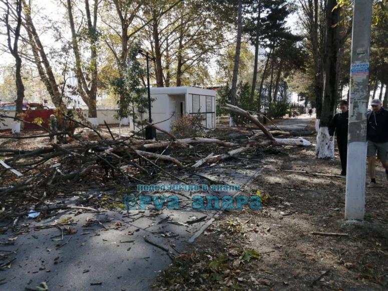 В Славянске-на-Кубани на пересечении улиц Запорожская и Победы упавшее дерево оборвало провода и перекрыло движение транспорта. В Анапе сообщают о поваленных деревьях в районе военкомата на улице Парковой. Повреждена лавочка и фонари.