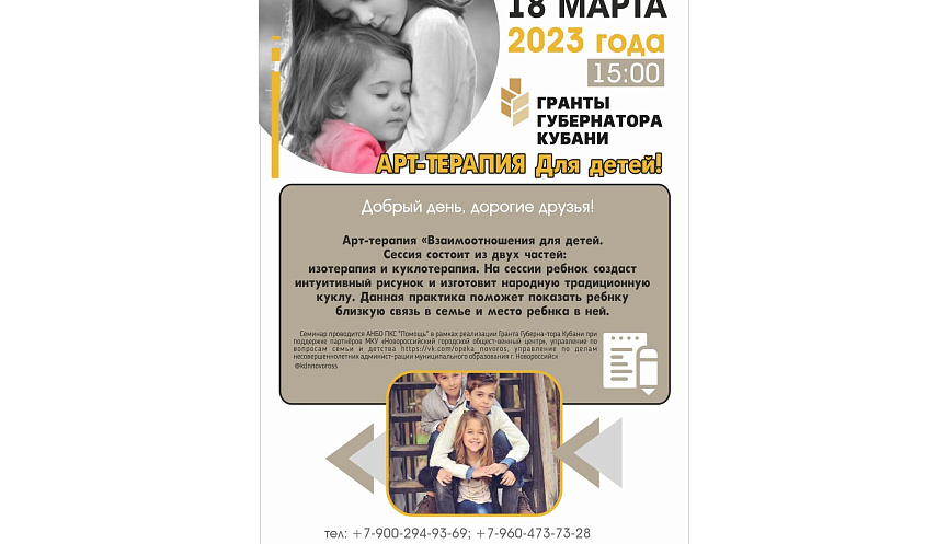 Сеансы арт-терапии и семинары проведут специалисты Автономной некоммерческой благотворительной организации поддержки в кризисной ситуации «Помощь» в рамках проекта, ставшего победителем конкурса «Гранты губернатора Кубани».