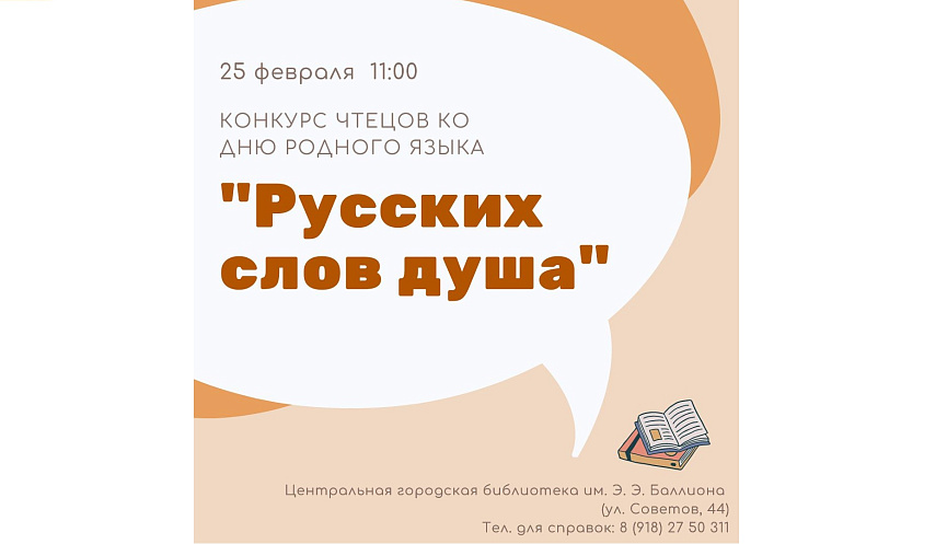 Конкурс чтецов «Русских слов душа» пройдёт в городской библиотеке им. Э.Э. Баллиона 25 февраля с 11:00 до 13:00. Принять участие в нём может любой желающий без ограничения возраста и рода деятельности. Конкурсантам предстоит выучить и продекламировать стихотворение и отрывок прозы о русском языке, сочинить собственное стихотворение, посвящённое великому и могучему русскому языку.