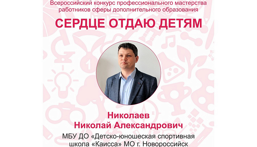 Педагог дополнительного образования МБУ ДО «Спортивная школа «КАИССА» города Новороссийска Николай Александрович Николаев стал финалистом регионального тура в числе 13 педагогов - участников конкурса из Краснодарского края.