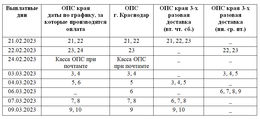 В связи с предстоящими праздничными и выходными днями в феврале и марте 2023 года и с учетом режима работы отделений почтовой связи (ОПС) на территории Краснодарского края Отделением Социального фонда России по Краснодарскому краю совместно с АО «Почта России» организован следующий порядок выплаты и доставки пенсий и других социальных выплат: