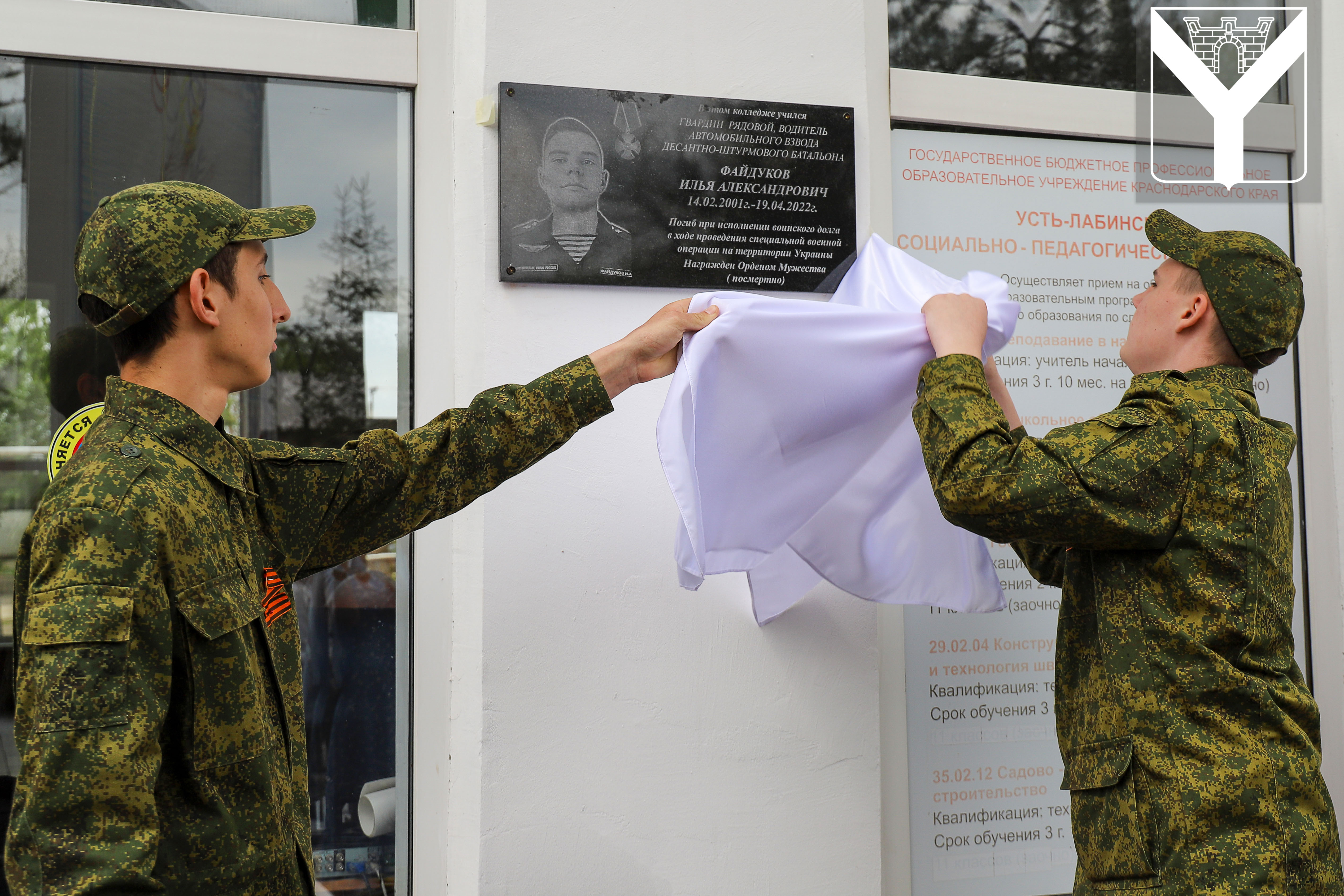 На здании Усть-Лабинского социально-педагогического колледжа установили памятную табличку рядовому Илье Александровичу Файдукову, погибшему при исполнении воинского долга в ходе проведения специальной военной операции.