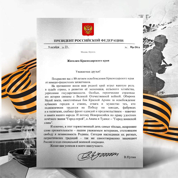 - На протяжении веков ваш родной край играл важную роль в судьбе страны, в развитии ее экономики, сельского хозяйства, укреплении государственности. Особые, героические страницы его истории связаны с Великой Отечественной войной. Оборона Малой земли, ожесточенные бои Красной Армии за освобождение кубанских городов и станиц, отвага и мужество тех, кто подвижнически трудился на Победу на заводах, фабриках и в госпиталях, снабжал фронт одеждой и продовольствием – навечно в памяти нашего народа. И потому Новороссийск по праву удостоен почетного звания «Город-герой», а Анапа и Туапсе – «Город воинской славы», - говорится в телеграмме Владимира Путина.