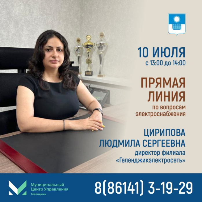 В эту среду, 10 июля, с 13:00 до 14:00 на базе МЦУ состоится «Прямая линия» по вопросам электроснабжения с директором филиала АО «Электросети Кубани» «Геленджикэлектросеть» Людмилой Цириповой.