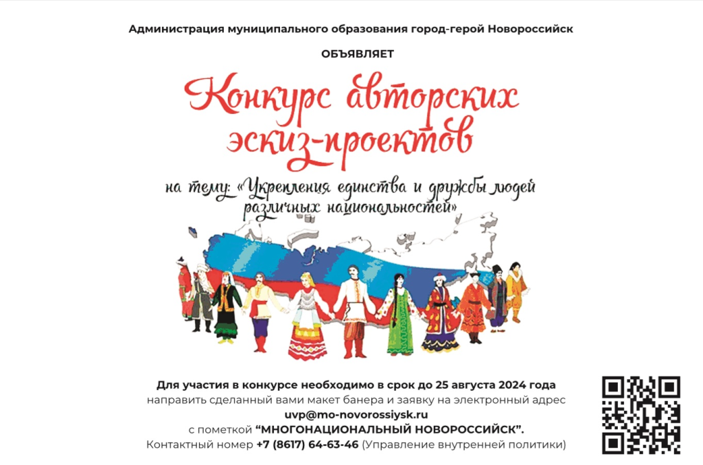 До 25 августа присылайте свои художественные работы - рисунки, фотографии, графические зарисовки или готовые эскиз-проекты о многообразии национальных культур Новороссийска на электронный адрес: [email protected] с пометкой «Многонациональный Новороссийск». Туда же необходимо отправить заявку на участие в конкурсе, заполненную в свободной форме с указанием ФИО, адреса и контактного телефона.