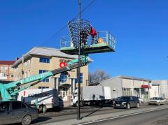 По улице Матросова начали монтаж светящихся элементов. Световые инсталляции на столбах будут служить круглогодично.