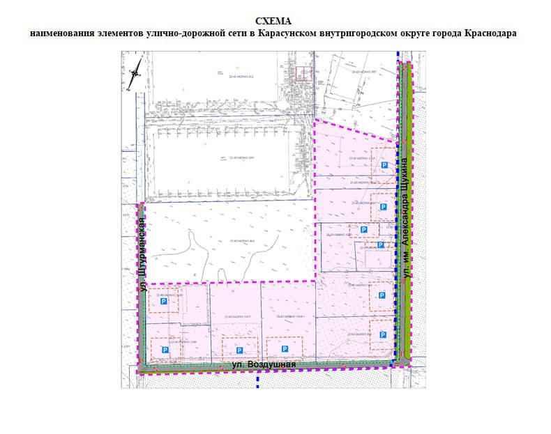 Депутаты городской Думы Краснодара на очередном заседании 21 сентября приняли решение присвоить следующие наименования трем улицам: с северо-запада на юго-восток — ул. Штурманская; с северо-запада на юго-восток — ул. им. Александра Щукина; с запада на северо-восток — ул. Воздушная.