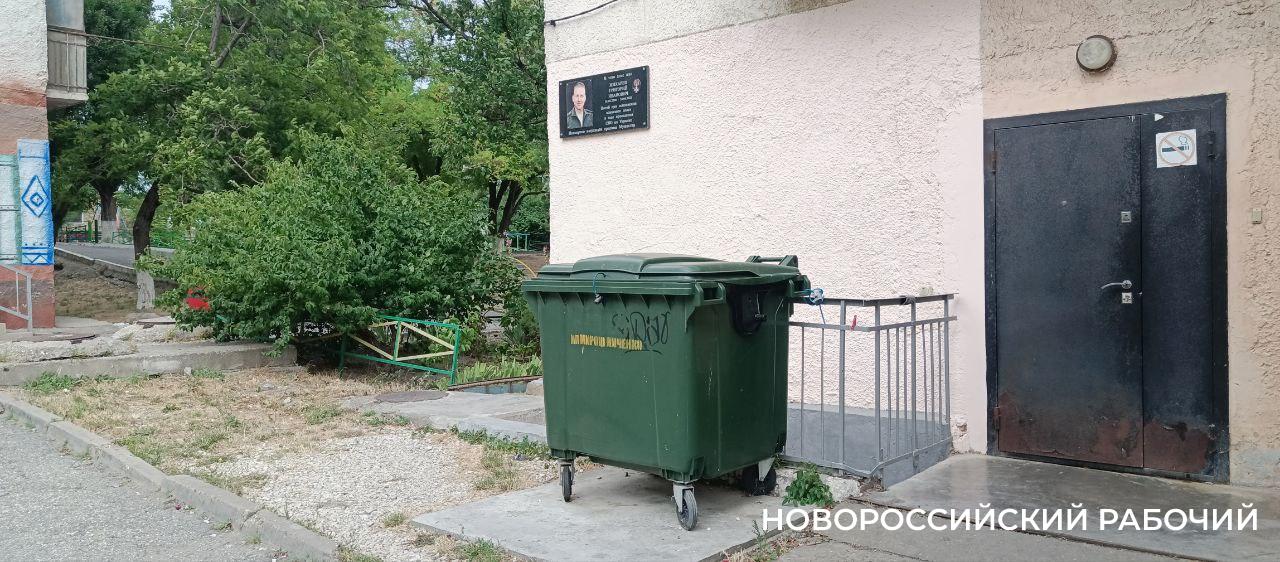 На прошлой неделе корреспонденты «Новороссийского рабочего» выезжали на ул. Куникова, 60 А, по тревожному сообщению новороссийцев. Наши читатели были возмущены, увидев возле мемориальной доски, установленной в память о погибшем участнике СВО, мусорный контейнер.