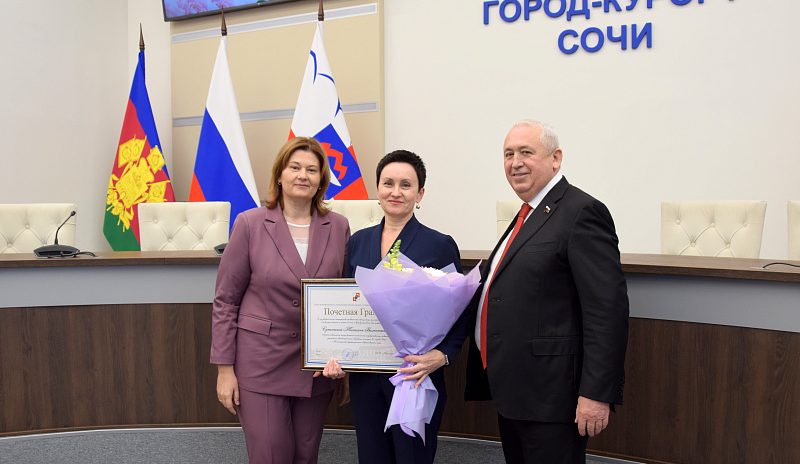 Заместитель главы Сочи Елена Канюк за добросовестный труд, личный вклад в развитие здравоохранения почетными грамотами главы города Сочи наградила 27 медицинских сестер.