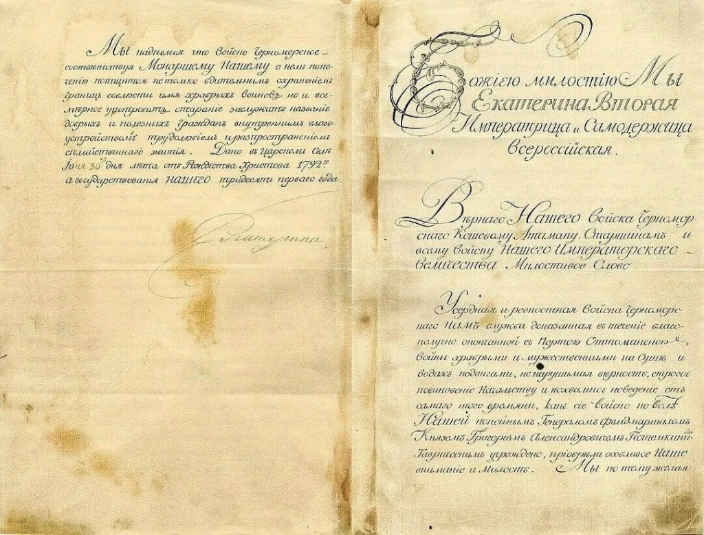 Жалованная грамота императрицы Екатерины II — один из главных документов Кубанского казачьего войска. Он позволил казакам содержать земли Кубани за свою преданную службу Российской империи. Сейчас жалованная грамота хранится в Краснодарский государственный историко-археологический музей-заповедник им. Е.Д. Фелицына.