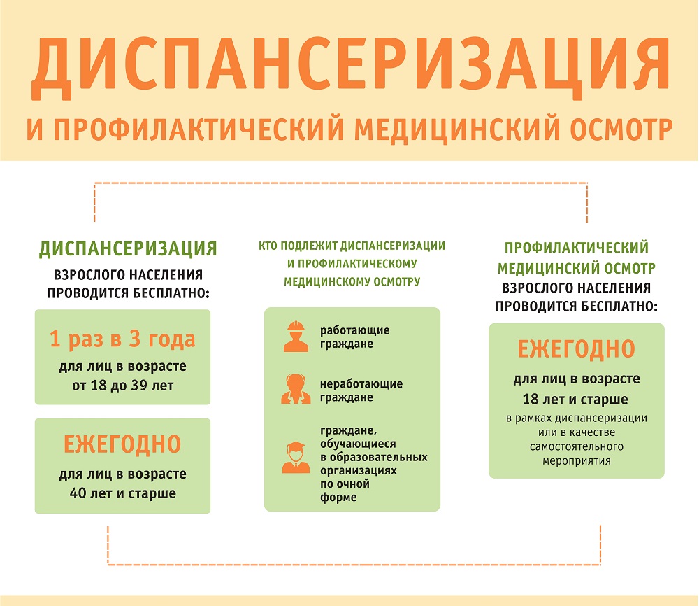 Периодичность проведения профилактического осмотра - 1 раз в год, при этом в один и тот же год нельзя пройти одновременно и медосмотр, и диспансеризацию.