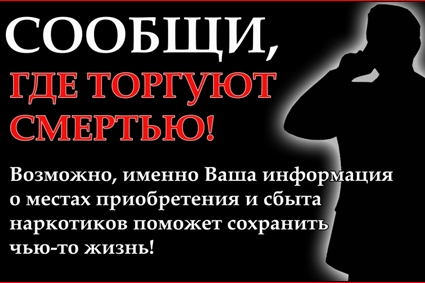 Если вы стали свидетелем распространения наркотиков или, возможно, даже жертвой подобной пропаганды, не оставайтесь в стороне, сообщите о распространении наркотиков! Ваше обращение может способствовать задержанию и впоследствии спасет большое количество человеческих жизней! Именно гражданская активность и неравнодушие является основным и самым важным критерием формирования здорового общества, без вредоносных веществ.